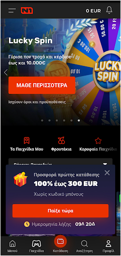 Με βάση τον κανονισμό εμπορικής επικοινωνίας, σε αυτή τη n1 casino αξιολόγηση θα σταθούμε μόνο στις προσφορές* που μπορείς να δεις χωρίς να έχεις κάνει είσοδο ν1. Σε κάθε περίπτωση, αν θέλεις να μάθεις όλες τις προωθητικές ενέργειες της εταιρίας, δεν έχεις παρά να κάνεις log in στον λογαριασμό σου ή να κάνεις εγγραφή αν δεν το έχεις ήδη κάνει.