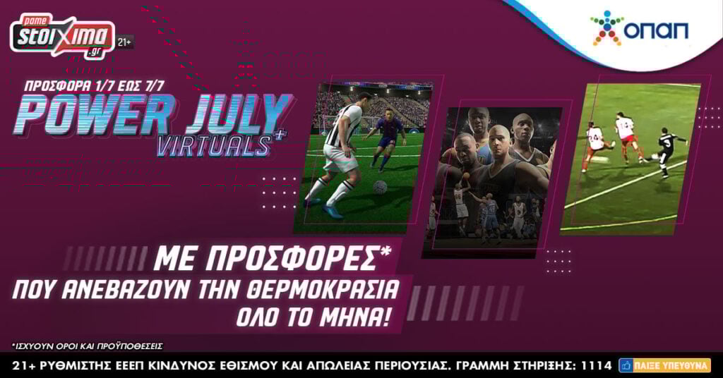 Ο Ιούλιος θα είναι… καυτός στο Pamestoixima.gr! Power July στα Virtuals+ με προσφορές* που ανεβάζουν τη θερμοκρασία όλο τον μήνα! Μπορεί, λοιπόν, η δράση σε ποδόσφαιρο και μπάσκετ να μειώνεται, ωστόσο στο Pamestoixima.gr υπάρχει ράλι προσφορών*, ενώ είναι διαθέσιμη η μεγαλύτερη ποικιλία virtual sports και στιγμιότυπα από πραγματικούς αγώνες του παρελθόντος!