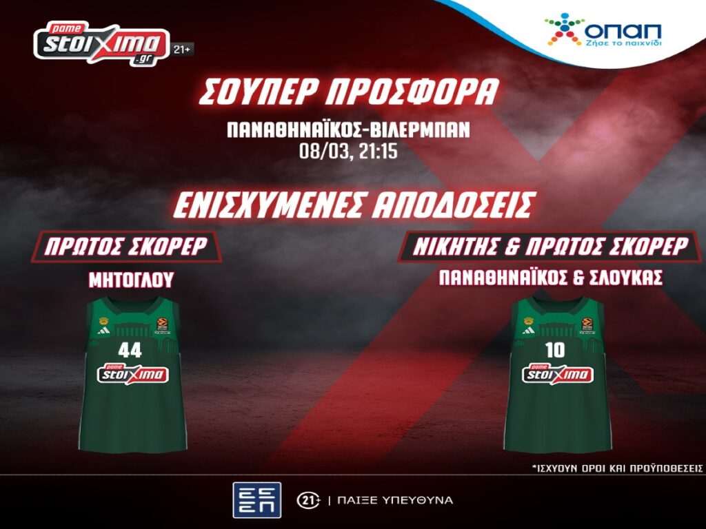 Το Παναθηναϊκός-Βιλερμπάν, για την 28η αγωνιστική της EuroLeague, παίζεται με σούπερ προσφορά* κι ενισχυμένες αποδόσεις στο Pamestoixima.gr!