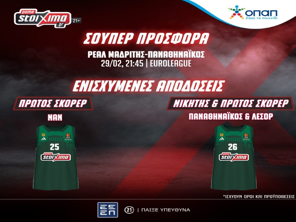 Το Ρεάλ Μαδρίτης-Παναθηναϊκός, για την 27η αγωνιστική της EuroLeague, παίζεται με σούπερ προσφορά* κι ενισχυμένες αποδόσεις στο Pamestoixima.gr!