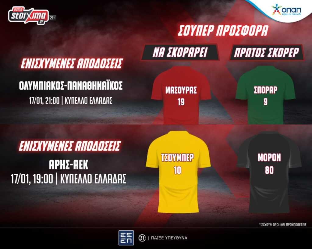 Το Pamestoixima.gr σε περιμένει με πολλές στοιχηματικές επιλογές για τις αναμετρήσεις του Κυπέλλου Ελλάδας, αλλά και σούπερ προσφορά* στο Ολυμπιακός-Παναθηναϊκός, για να απολαύσεις τη δράση στο έπακρο.