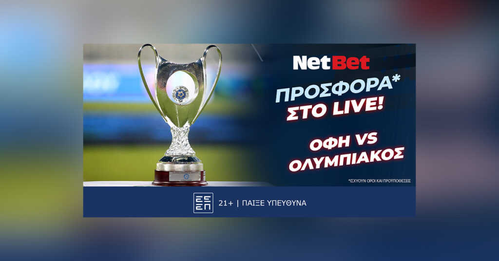 ΟΦΗ και Ολυμπιακός διεκδικούν το φετινό Κύπελλο Ελλάδος στον τελικό του ΟΑΚΑ. Μια αναμέτρηση που μπορείτε φυσικά να απολαύσετε στη NetBet Ελλάδα, την κορυφαία εν Ελλάδι εταιρεία για στοίχημα με καθημερινές προσφορές*, αμέτρητες αγορές, κορυφαίες αποδόσεις, μοναδικό bet builder και άπλετα ειδικά στοιχήματα.
