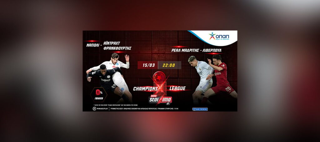 Η φάση των «16» του Champions League ολοκληρώνεται με τα Ρεάλ-Λίβερπουλ και Νάπολι-Άιντραχτ, τα οποία βρίσκεις στο νέο Pamestoixima.gr με 0% γκανιότα**!