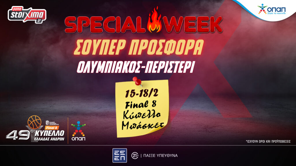 Στο Pamestoixima.gr σε περιμένει όλη η δράση του ΟΠΑΠ Final 8 Κυπέλλου Ελλάδος Μπάσκετ και σήμερα βρίσκεις και σούπερ προσφορά* για το Ολυμπιακός-Περιστέρι.