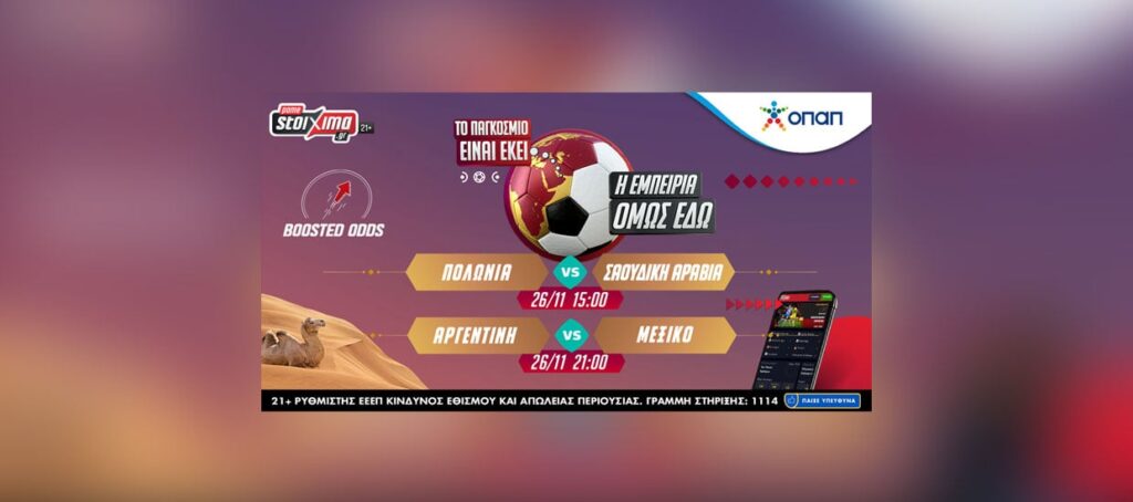Τυνησία – Αυστραλία, Πολωνία – Σαουδική Αραβία, Γαλλία – Δανία, Αργεντινή – Μεξικό με ενισχυμένες αποδόσεις στο Τελικό Αποτέλεσμα κι Επιστροφή Χρημάτων στο 0-0 (στην αγορά πρώτο σκόρερ)*.