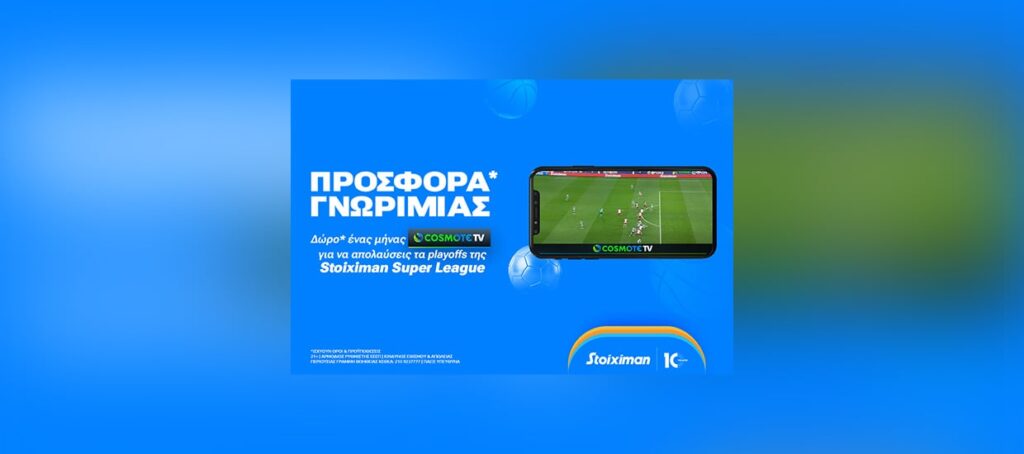 Τα πιο συναρπαστικά Playoffs του ελληνικού πρωταθλήματος είναι εδώ και η Stoiximan, μεγάλος χορηγός της της Super League, φέρνει τους αγώνες στο σπίτι σου! Πώς; Με μία εκπληκτική προσφορά* γνωριμίας για να απολαύσεις δώρο* ένα μήνα το πλούσιο αθλητικό περιεχόμενο της Cosmote TV που περιλαμβάνει μεταξύ άλλων αγώνες των Playoffs & των Playouts της Stoiximan Super League!