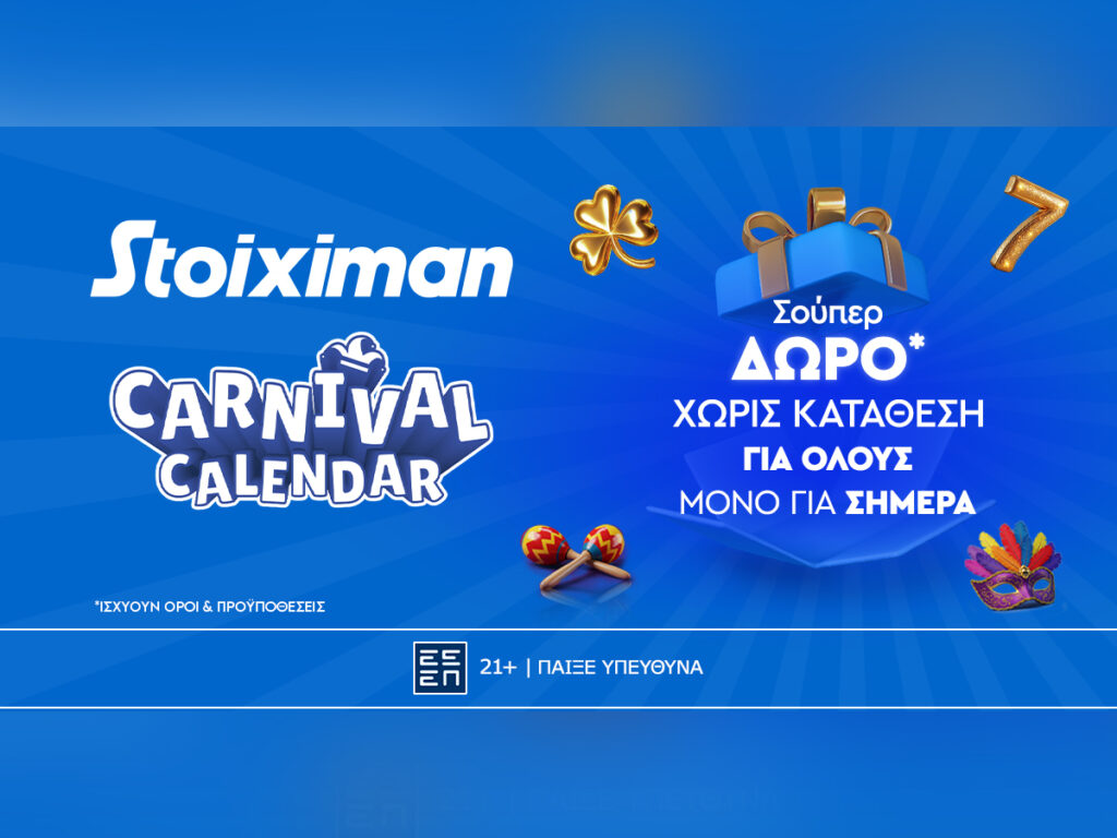 Μία υπέροχη εβδομάδα αρχίζει για σένα στη Stoiximan. To Carnival Calendar, ένα ημερολόγιο προσφορών με καθημερινές εκπλήξεις, δώρα* κι έπαθλα* και στο Live Casino, κάνει πρεμιέρα με 5 δώρα* σε όλους!