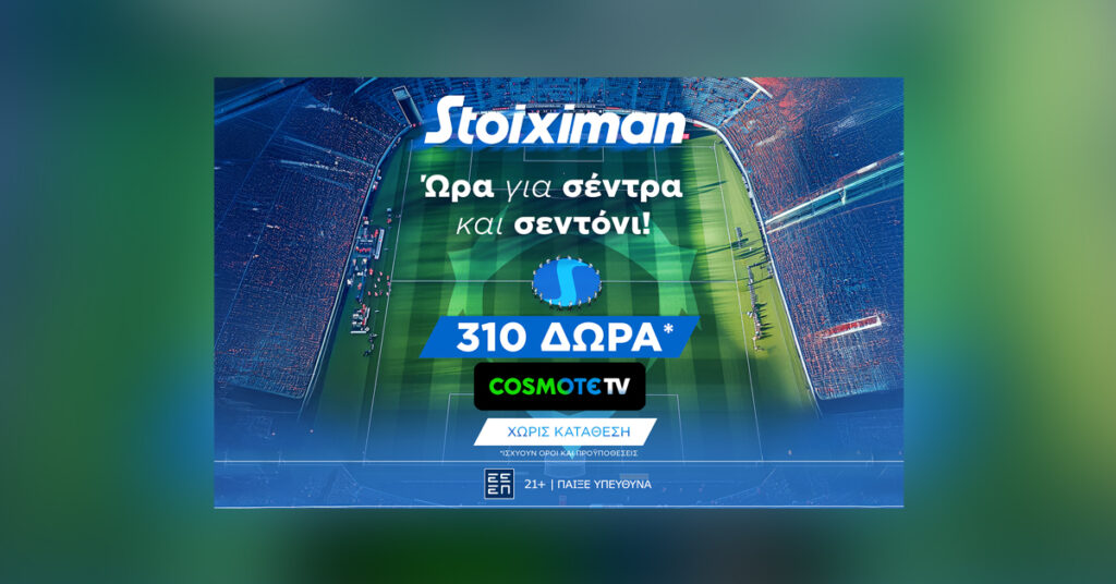 Αν επιθυμείς να γίνεις μέλος της Stoiximan, αξίζει να το κάνεις κάπου εδώ. Με την εγγραφή σου, παίρνεις αυτόματα 310 δώρα* χωρίς κατάθεση και μία μέρα δωρεάν* πρόσβαση στην πλατφόρμα και το αθλητικό περιεχόμενο της Cosmote TV! Αν προχωρήσεις και στην πρώτη σου κατάθεση αμέσως μετά, τα δώρα* γίνονται 620 και παράλληλα, κερδίζεις έναν ολόκληρο μήνα πρόσβασης στην Cosmote TV!