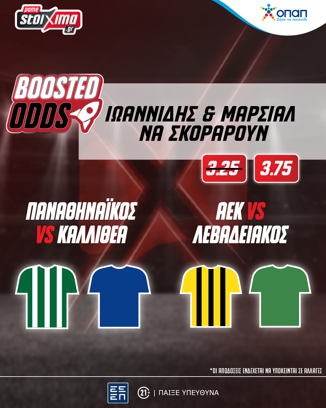 Στο Pamestoixima.gr βρίσκεις πολλές στοιχηματικές επιλογές για όλους τους αγώνες, για να ζήσεις στο έπακρο τη δράση της Super League! Αλλά και το Boosted Odd που συνδυάζει τους δύο αγώνες ΑΕΚ-Λεβαδειακός και Παναθηναϊκός-Καλλιθέα της Super League: