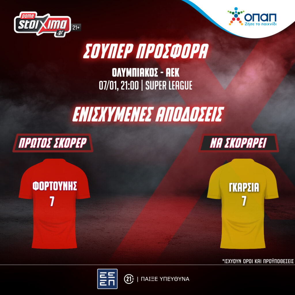 Για το Ολυμπιακός-ΑΕΚ βρίσκεις σούπερ προσφορά*, την αναμέτρηση με ενισχυμένη απόδοση** στο τελικό αποτέλεσμα, αλλά κι ενισχυμένες αποδόσεις στις παρακάτω αγορές: