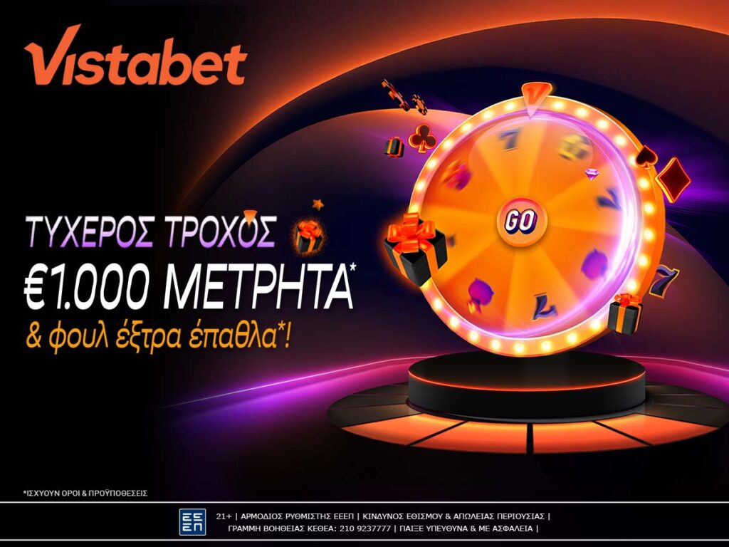 O Τυχερός Τροχός γυρίζει μοιράζοντας €1.000 μετρητά* και φουλ έξτρα έπαθλα*, με δωρεάν συμμετοχή κι εσύ νιώθεις… Vistabet!